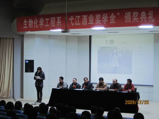 1225下午,生物化学工程系2009年“弋江酒业奖学金”颁奖典礼在学术报告厅隆重举行。出席本次颁奖典礼的有:弋江酒业有限公司陈曾木总经理、沈海宁厂长、生化系党总支书记潘世春、副书记章兵,食品科学与工程专业教研室主任季长路老师以及相关辅导员老师。颁奖典礼由系团总支副书记邹俊主持,获奖同学和食品专业大一、大二全体同学参加了颁奖典礼。