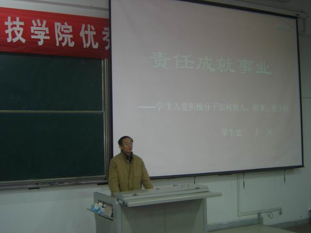 为进一步培养机械工程系分党校第17期全体学员的党员意识和责任意识, 1229日晚7学生处处长王河在5217做了主题为“责任成就事业——学生入党积极分子如何做人、做事、做学问”的专题讲座。本期党课教育培训班班主任张礼波老师及全体学员出席此次讲座。
